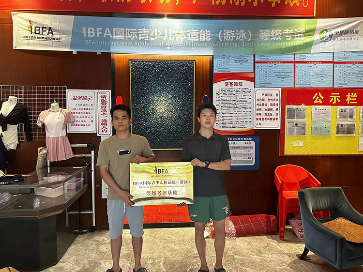 经考察团综合评定,确认欢乐恒温游泳馆的场地标准、考评条件、学员评价等符合IBFA国际青少儿体适能(游泳)等级考评基地授权标准,准许授予“IBFA国际青少儿体适能(游泳)等级考评基地”牌匾。